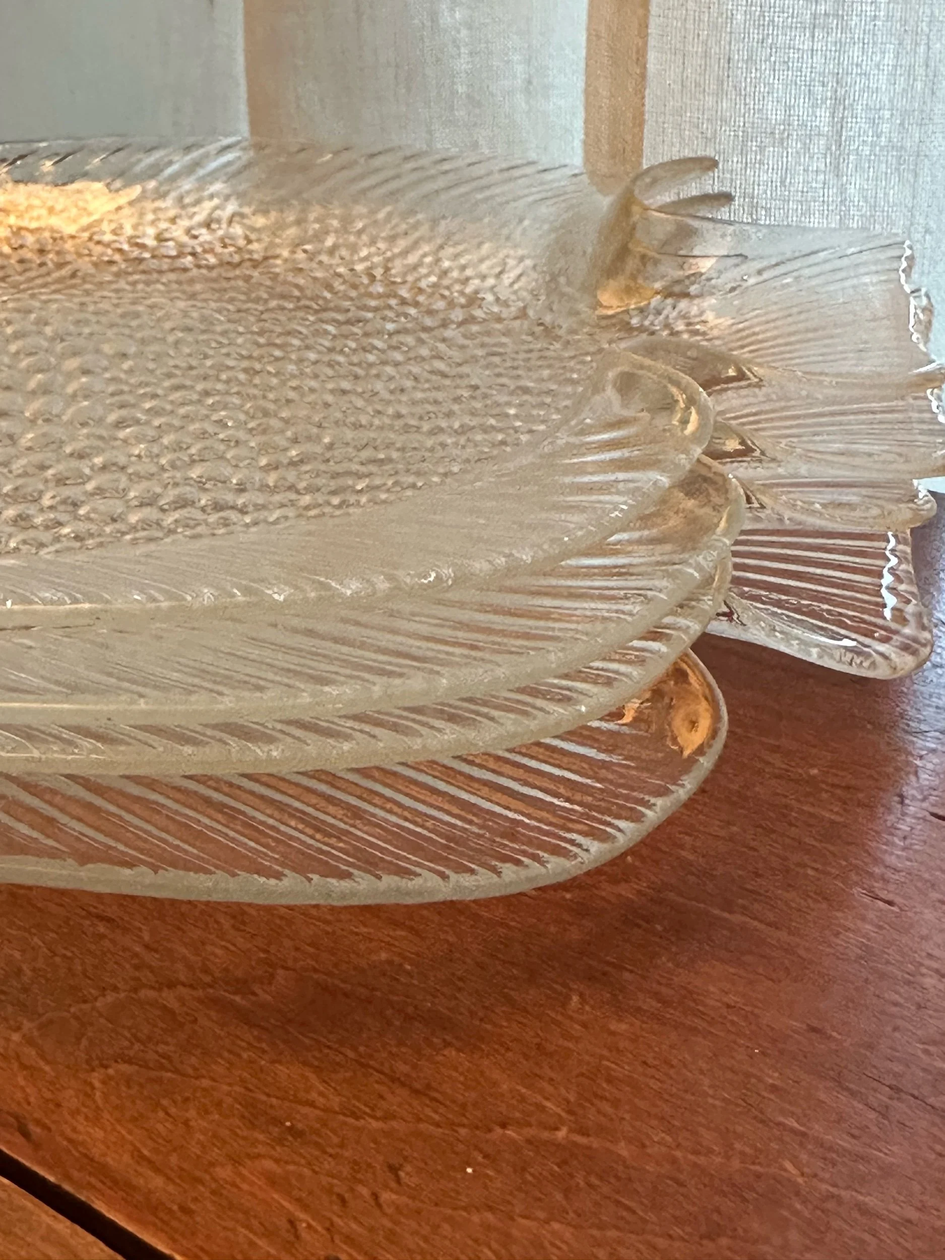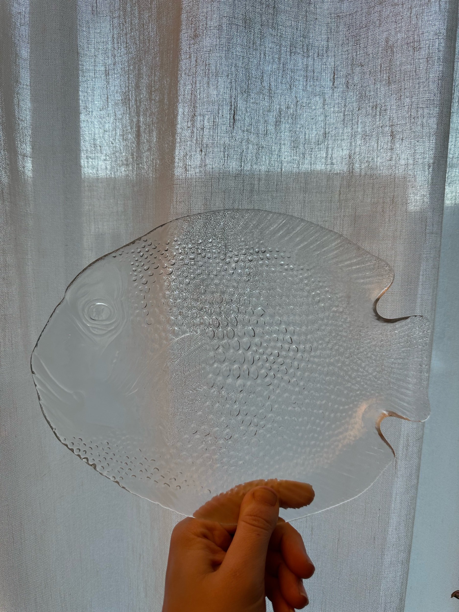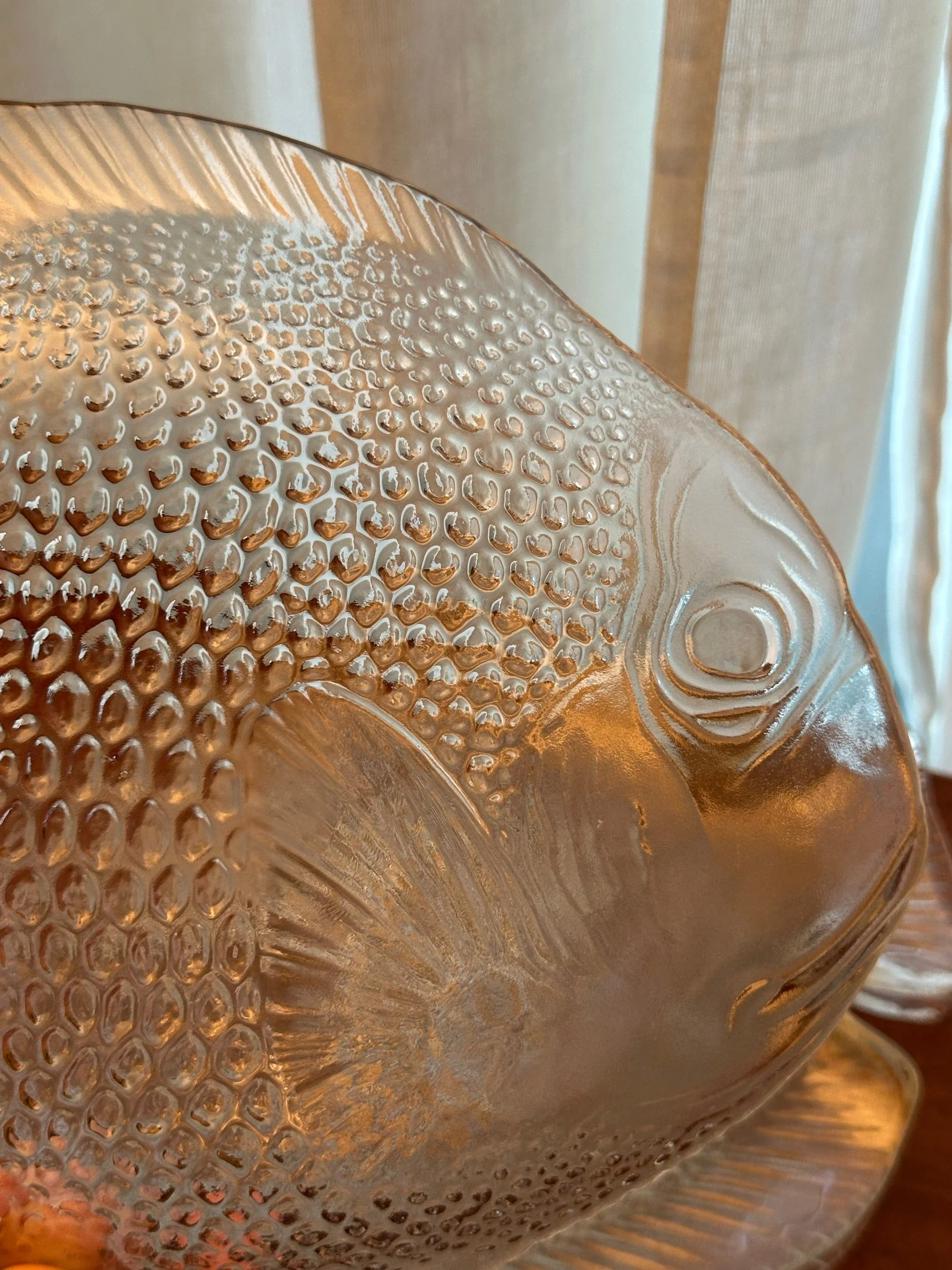 Delicate and quietly dramatic, these vintage French fish plates feature a Rococo fish silhouette with beautifully textured scales and softly frosted glass. The sculptural fish form feels both whimsical and refined - the kind of piece that instantly elevates a table or gallery wall.