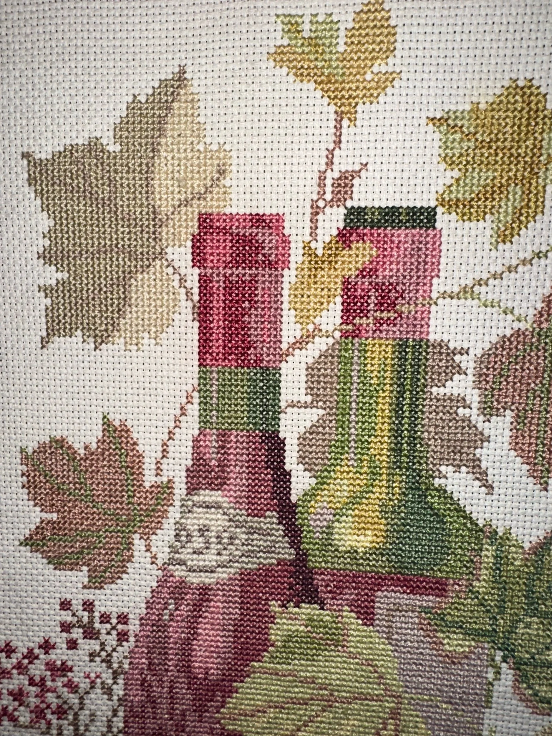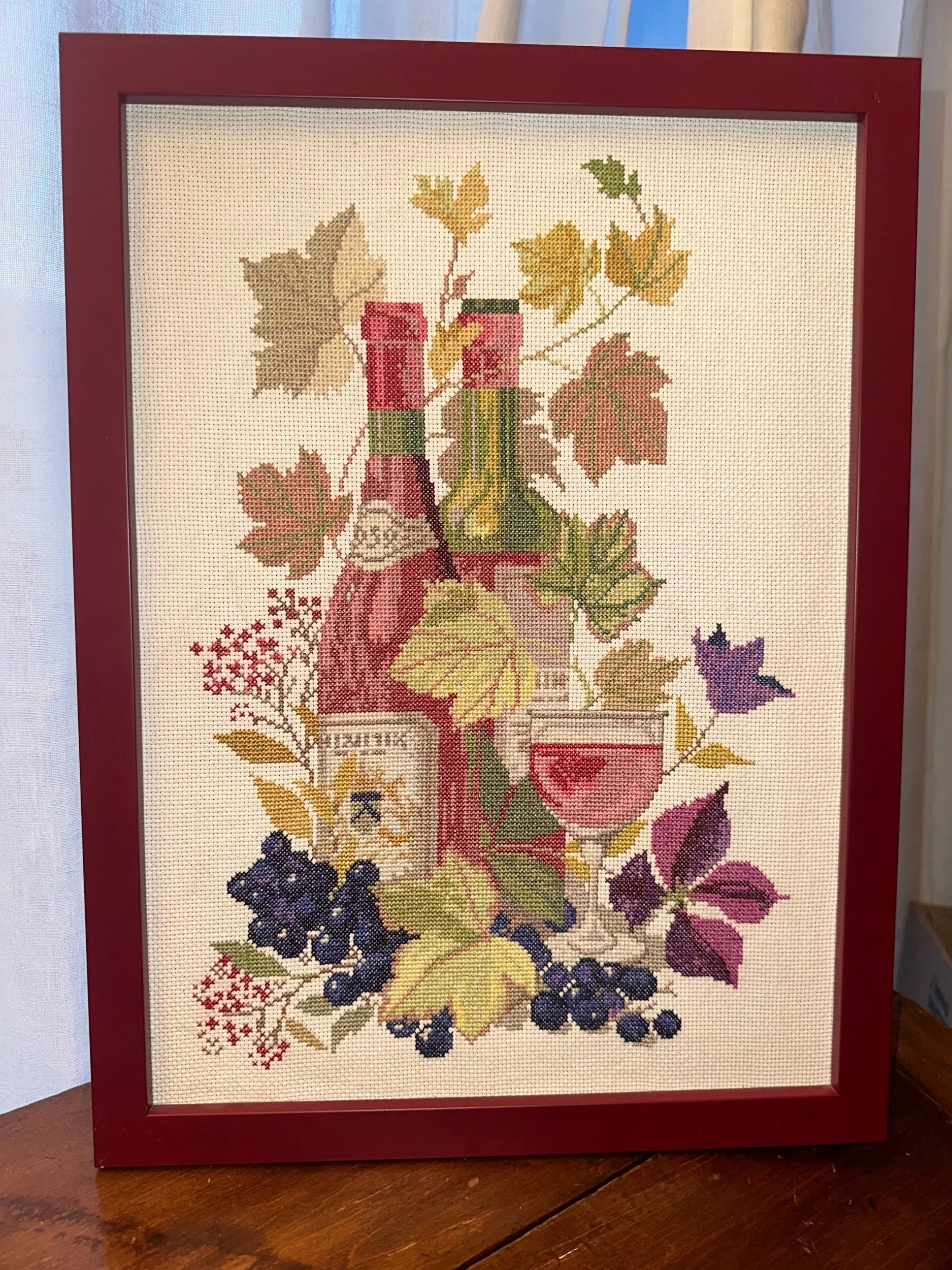 A beautifully detailed vintage needlepoint featuring a romantic wine still life scene. Rich burgundy and olive-toned bottles are surrounded by cascading grapevines, autumn leaves, and a delicately filled wine glass - all stitched with intricate texture and depth. The warm palette of merlot, moss, plum, and golden ochre makes this piece especially inviting for kitchens, dining rooms, or cozy bar corners.